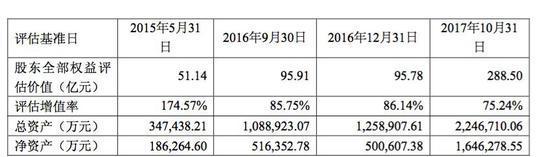 根據(jù)天健興業(yè)出具的《置入資產(chǎn)評估報告》顯示, 截至評估基準日2017年10月31日, 采用市場法評估后的北汽新能源估值為288.50億元,增值率75.24%,報告提醒投資者“充分關注評估增值的風險”。