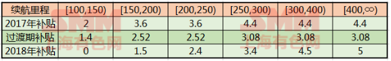 續(xù)航里程單位km 補貼單位萬元