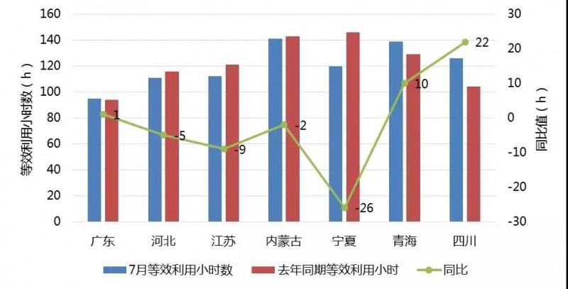 由以上圖表可以看出,2018年7月,除廣東、青海和四川外,其他省份的利用小時數(shù)均較去年同期低。四川省的平均等效利用小時數(shù)較去年同期同比增加22小時,寧夏省的平均等效利用小時數(shù)較去年同期同比減少26小時。