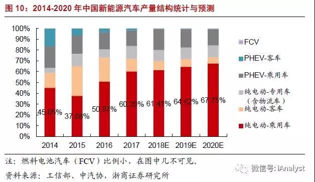 我們判斷,純電動乘用車將成為未來新能源汽車市場的重要增量,預計2020年產(chǎn)量將達到135.50萬輛,約占當年新能源汽車總產(chǎn)量的2/3,自2017年的年均復合增速為41.5%。2014-2020年中國新能源汽車產(chǎn)量結構如圖10所示。