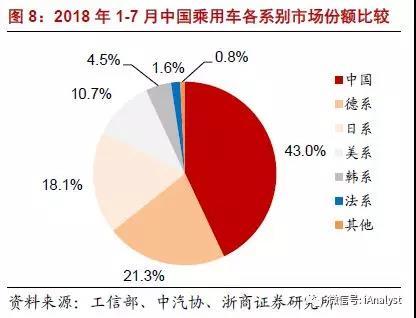 總的來說,2018年1-7月,在以燃油車為主的中國乘用車市場中,外資車系仍占主流,合計份額為57%。其中,德系、日系占比居前,份額分別為21.3%和18.1%,如圖8所示。由此可見,如果未來外資車企發(fā)力中國新能源乘用車市場,將進一步加快乘用車電動化趨勢。
