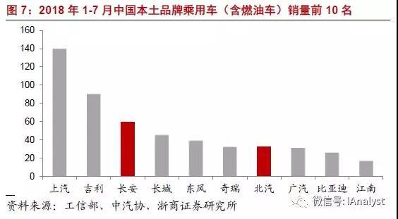 據(jù)媒體報道,長安汽車、北汽集團和海馬汽車近期宣布,將于2025年停售傳統(tǒng)燃油車(或不含高效內燃機汽車)。其中,長安與北汽1-7月乘用車銷量在本土品牌中分別排名第3名、第7名,銷量分別為59.3萬輛、32.2萬輛,如圖7所示。據(jù)乘聯(lián)會統(tǒng)計數(shù)據(jù),它們的新能源汽車銷量分別為1.26萬輛、6.67萬輛,在各自乘用車總銷量中的占比分別為2.12%、20.7%,仍有很大的提高空間。
