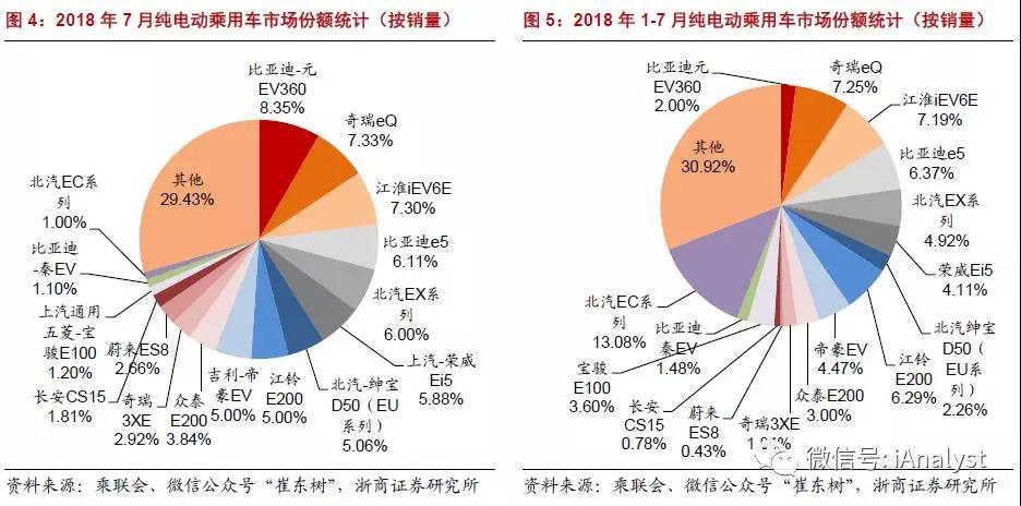1-7月純電動乘用車市場累計銷量位于前列的車型有:北汽EC系列,4.04萬輛;奇瑞eQ,2.24 萬輛;江淮iEV6E,2.22萬輛;比亞迪e5,1.97萬輛;江鈴E200,1.94 萬輛。我們據(jù)此測算,這5款車型合計銷量為10.5萬輛,占純電動乘用車總銷量的40.3%,如圖5 所示。