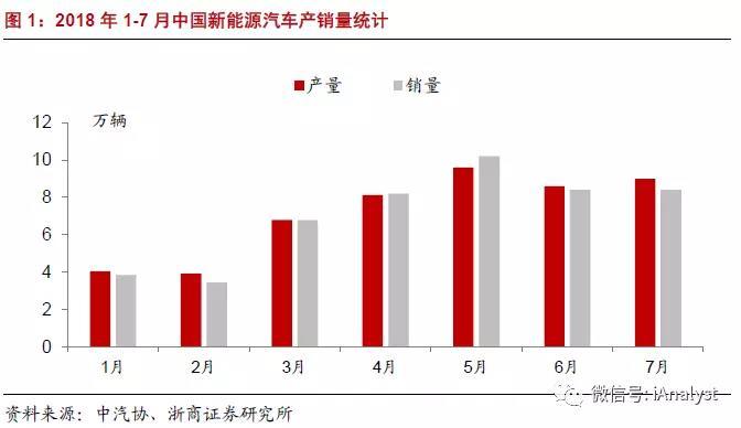 據(jù)中國汽車工業(yè)協(xié)會統(tǒng)計,2018年7月新能源汽車產(chǎn)銷量分別為9.0萬輛、8.4萬輛,同比增長53.6%、47.7%,環(huán)比分別增長5.5%、下降0.9%;1-7月累計產(chǎn)銷量分別為50.4萬輛、49.6萬輛,同比增長85.0%、97.1%。2018年以來各月份的產(chǎn)銷統(tǒng)計如圖1所示。