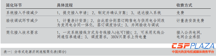 2013年2月27日,中國(guó)國(guó)家電網(wǎng)公司召開加強(qiáng)分布式電源并網(wǎng)服務(wù)電視電話會(huì)議暨新聞發(fā)布會(huì),發(fā)布了《關(guān)于做好分布式電源并網(wǎng)服務(wù)工作的意見》、《關(guān)于促進(jìn)分布式電源并網(wǎng)管理工作的意見》、《分布式電源接入配電網(wǎng)相關(guān)技術(shù)規(guī)范》三個(gè)文件,其中適用于分布式光伏發(fā)電,與居民息息相關(guān)的一些工作細(xì)項(xiàng)做了進(jìn)一步簡(jiǎn)化與明確規(guī)定,詳見表一。