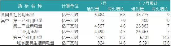 從產(chǎn)業(yè)分類看,1-7月份,第一產(chǎn)業(yè)用電量400億千瓦時,同比增長10%。受國民經(jīng)濟(jì)持續(xù)向好的影響,尤其體現(xiàn)在制造產(chǎn)業(yè),第二產(chǎn)業(yè)用電量持續(xù)較快增長,同比增長7%,拉動全社會用電量增長4.9個百分點(diǎn),對全社會用電量增長的貢獻(xiàn)率為54.9%。第三產(chǎn)業(yè)和城鄉(xiāng)居民生活用電量同比分別增長14.2%和13.6%,分別拉動全社會用電量增長2.1個和1.8個百分點(diǎn),保持了自今年以來較快增長的平穩(wěn)勢頭。