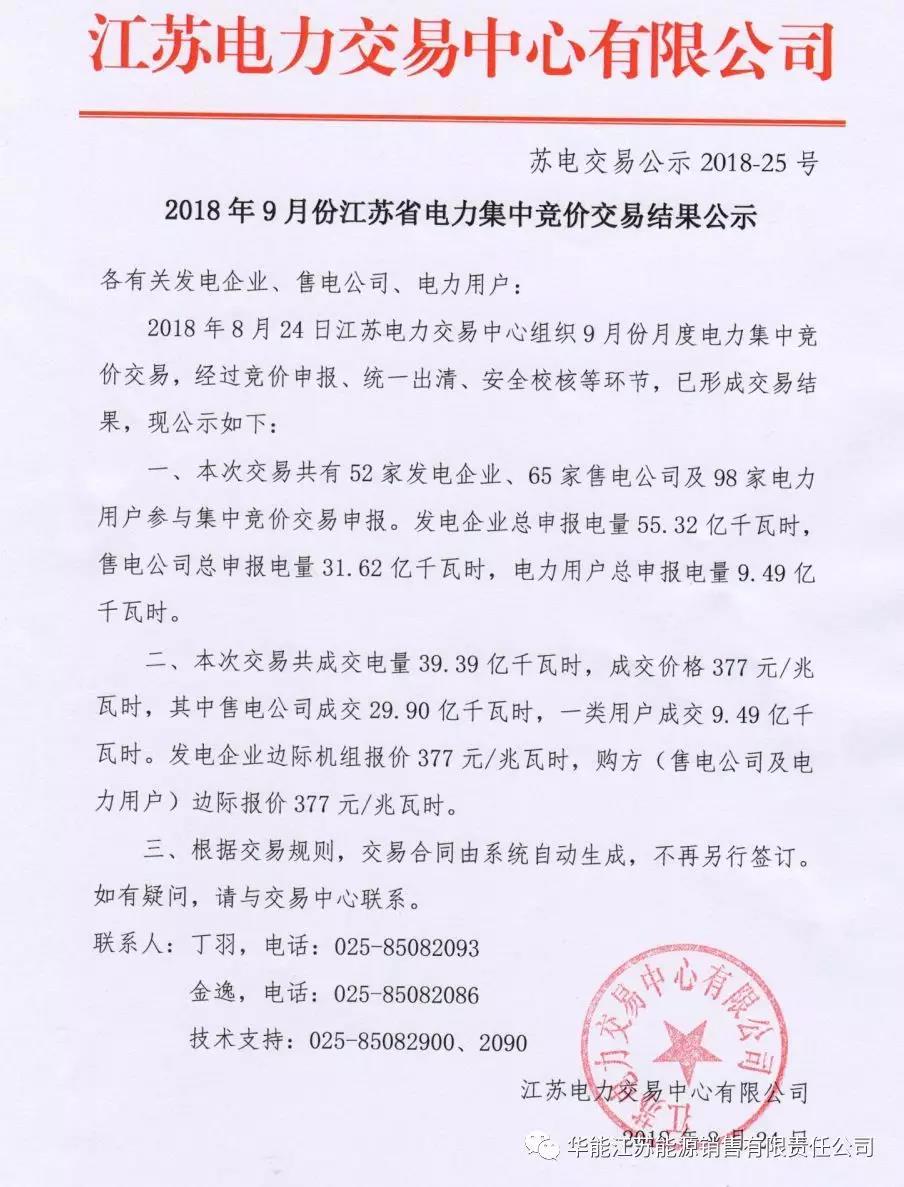 2018年9月江蘇省電力集中競價交易結(jié)果