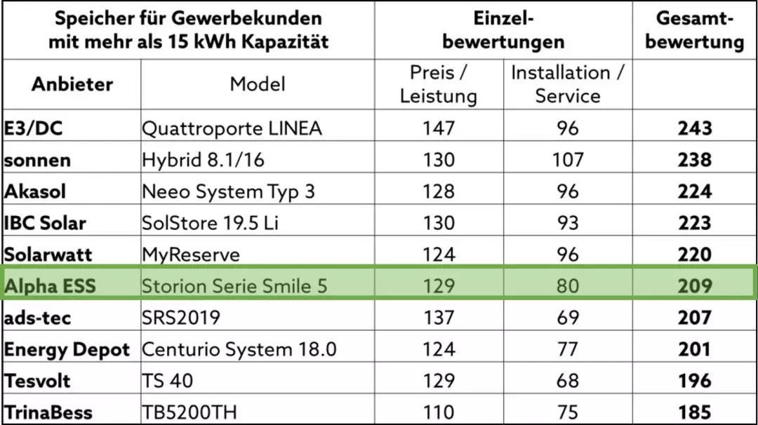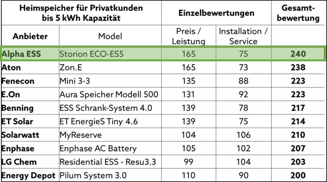 EuPDResearch的波恩專家,分析了來自歐洲75家公司的114種儲(chǔ)能產(chǎn)品,按電池容量不同,劃分成5kWh以下,5-10kWh,10-15kWh,15kWh以上四個(gè)量級(jí),分別從價(jià)格、性能、安裝及服務(wù)等方面進(jìn)行評(píng)比得出四組排行榜單。其中3組,沃太能源都入榜前十,尤其是5kWh以下這一量級(jí),沃太能源的經(jīng)濟(jì)小巧、一體化儲(chǔ)能系統(tǒng)Storion ECO-ES5力壓群雄,榮登榜首。