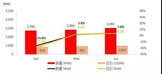 相較于5月,6月的中國組件出口量增加7.0%,出口額度則增加了6.5%。