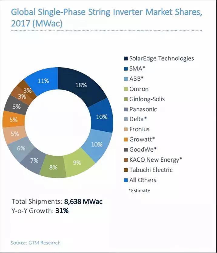 全球單相組串式逆變器榜單中,SolarEdge排名第一,SMA、ABB位居第二、三位,中國企業(yè)錦浪、臺達(dá)、古瑞瓦特、固德威均進(jìn)入全球前十。