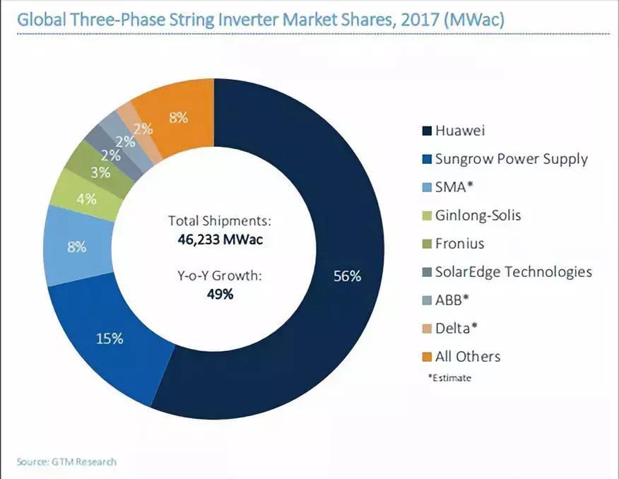 近日,GTM Research發(fā)布了2017年度全球光伏組串式逆變器排名,多家中國光伏逆變器制造商上榜。根據(jù)排名,華為、陽光電源、SMA位列全球三相組串式逆變器前三甲,錦浪排名第四。