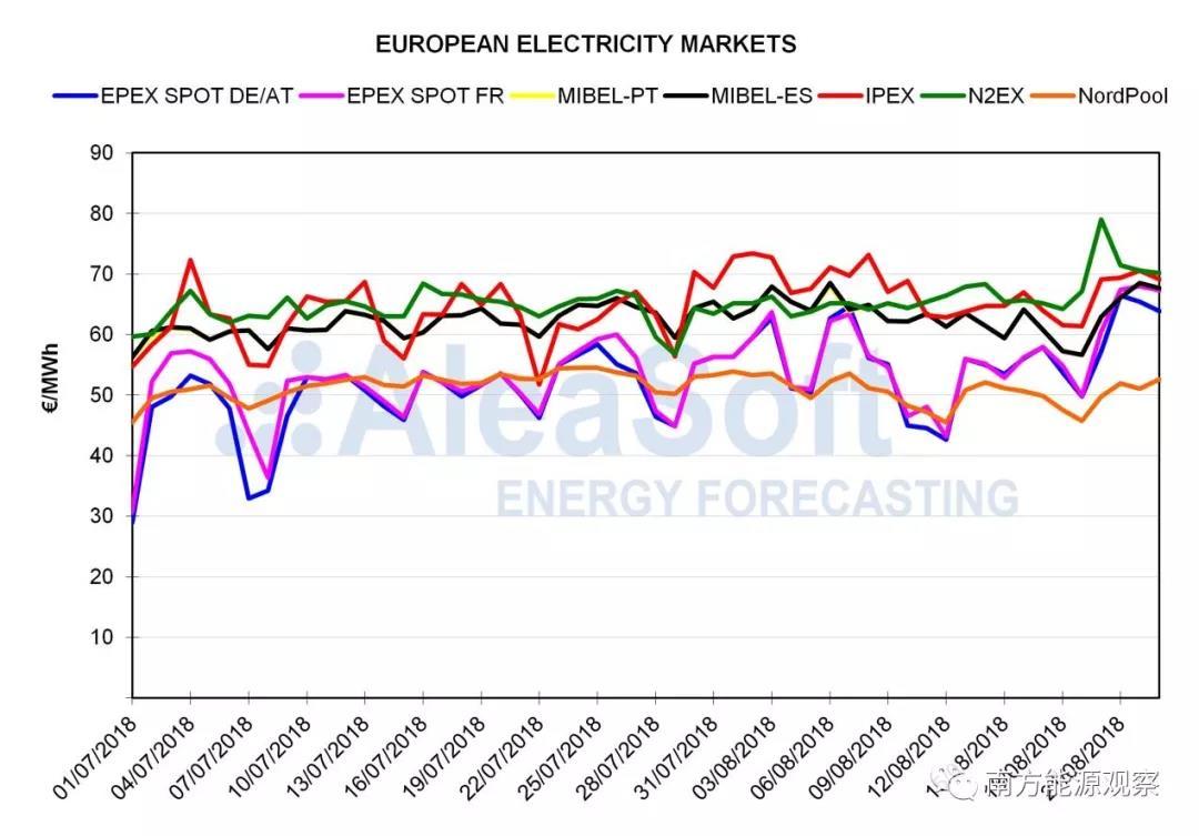 截止8月22日,MIBEL現(xiàn)貨市場的平均價格達(dá)到68.52歐元/兆瓦時,法國現(xiàn)貨市場平均價格達(dá)到68.02歐元/兆瓦時,而德國平均價格為8月21日為66.45歐元/兆瓦時。法國和德國的EPEX現(xiàn)貨市場價格漲幅最高,幾乎接近MIBEL市場、意大利和英國市場的現(xiàn)貨水平。北歐的Nord Pool市場是價格最低的市場之一,但其價格也異常高漲。2017年8月,NordPool價格約為26歐元/MWh,但其今年的價格已經(jīng)接近55歐元/ MWh,比一年前增加了一倍多。歐洲多地電力價格上漲背后的原因是什么?電價高漲之下,地方又怎樣應(yīng)對?各地電力價格還會繼續(xù)上漲嗎?這些問題值得一探究竟。