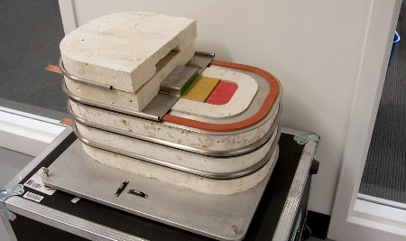 早期實(shí)物模型顯示堆疊的電池單元。厚厚的一層泡沫絕緣材料包裹著核心的電池。中心的彩色材料片代表熔化的電池材料。