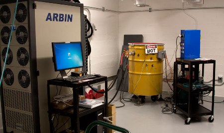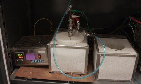 公司的大多數(shù)測(cè)試都是用4英寸的電池進(jìn)行的。這里顯示的電池是在絕緣加熱器內(nèi)。電池內(nèi)的電極和電解質(zhì)在室溫下是固體,但需要熔化,以供電池運(yùn)行。在這種情況下,電池被加熱到650℃,但是,電池通常運(yùn)行于500°C。在熔融狀態(tài)下,電極材料的導(dǎo)電性是很高的,這就使電池充電和放電都很迅速。