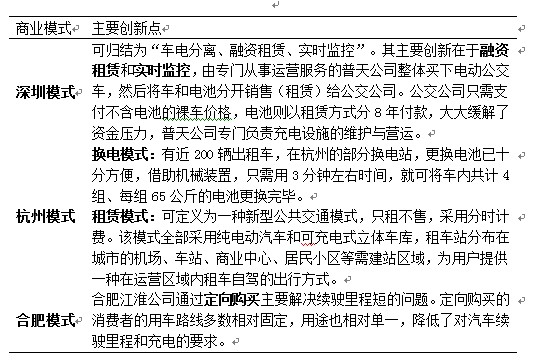 三種模式市場(chǎng)切入點(diǎn)各不相同,各具特色,深圳模式適合于統(tǒng)一采購(gòu)的公交和市政服務(wù)等領(lǐng)域;分時(shí)租賃模式比傳統(tǒng)汽車(chē)租賃更加便宜,更加便利;換電模式解決了充電難的問(wèn)題;定向購(gòu)買(mǎi)模式定位于細(xì)分市場(chǎng),適合于固定路線和單一用途的消費(fèi)者,同時(shí)解決了充電難問(wèn)題。