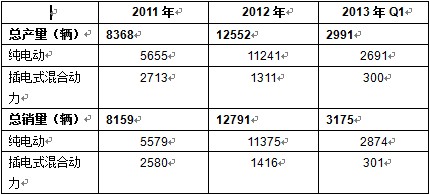 表1 2011-2013年Q1中國(guó)新能源汽車(chē)產(chǎn)銷量