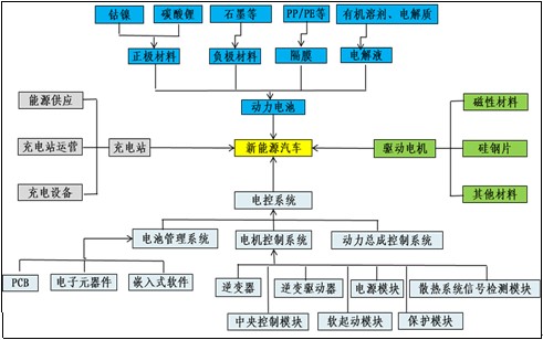 新能源汽車(chē)產(chǎn)業(yè)鏈包含能量系統(tǒng)(高性能電池材料、動(dòng)力電池)、驅(qū)動(dòng)系統(tǒng)(驅(qū)動(dòng)電機(jī)、驅(qū)動(dòng)系統(tǒng))、控制系統(tǒng)(電池管理系統(tǒng)、電控制系統(tǒng))和基礎(chǔ)設(shè)施(充電站、充電設(shè)備)等細(xì)分環(huán)節(jié)。新能源汽車(chē)產(chǎn)業(yè)鏈往上可延伸到鋰、稀土、鎳、錳等金屬礦產(chǎn)資源,往下包含新能源汽車(chē)整車(chē)運(yùn)營(yíng)及服務(wù)等環(huán)節(jié)。
