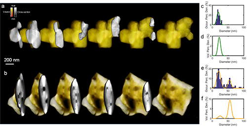 圖4 (a)和(b)電極顆粒在電化學(xué)循環(huán)前后的三維形貌圖;(c)和(d)循環(huán)前材料顆粒中內(nèi)部微孔孔徑分布統(tǒng)計(jì);(e)和(f)循環(huán)后材料顆粒中內(nèi)部微孔孔徑分布統(tǒng)計(jì)。