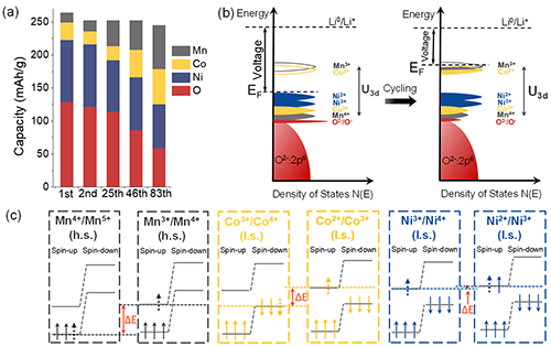 圖3 Li1.2Ni0.15Co0.1Mn0.55O2不同充放電周次的氧化還原反應(yīng)(a)不同元素在不同充放電周次對(duì)容量的貢獻(xiàn);(b)電子結(jié)構(gòu)變化帶來的鋰離子儲(chǔ)存電勢(shì)的變化;(c)不同過渡金屬氧化還原電對(duì)能級(jí)差異與電壓衰減關(guān)聯(lián)。