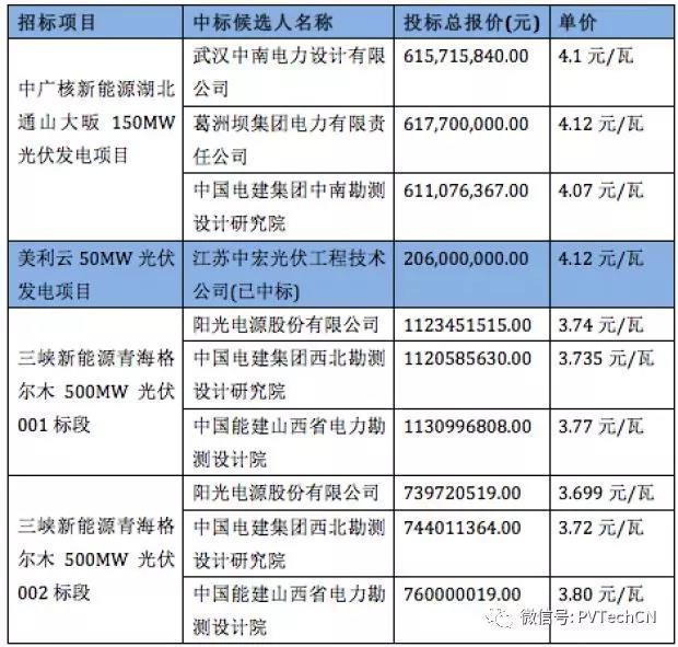 中國(guó)儲(chǔ)能網(wǎng)訊:不久前,三峽新能源公示青海省格爾木500MW和陜西渭南100MW光伏發(fā)電應(yīng)用領(lǐng)跑者項(xiàng)目EPC總承包中標(biāo)候選人,陽(yáng)光電源分別以約為3.745元/瓦、3.699元/瓦、4.847元/瓦的單瓦報(bào)價(jià)位列兩個(gè)招標(biāo)共三個(gè)標(biāo)段的第一候選人。