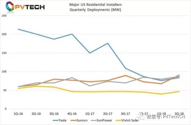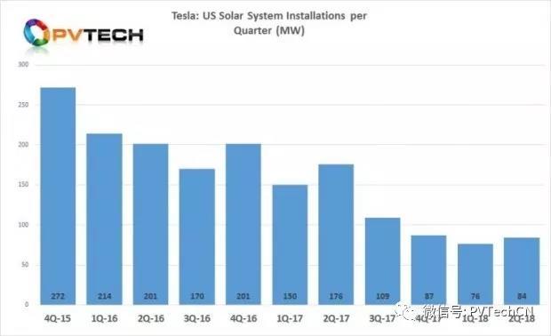 特斯拉的太陽能季度裝機量數(shù)值迅速下降, 但2018年二季度又出現(xiàn)小幅上升。