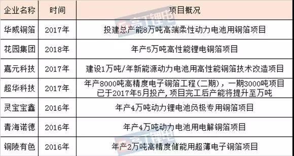 高工鋰電根據(jù)公開信息盤點2016-2018年產(chǎn)能規(guī)劃在萬噸級的鋰電銅箔項目,共計有華威銅箔、花園集團(tuán)、嘉元科技、超華科技、靈寶華鑫、諾德股份、銅陵有色等8家企業(yè)宣布投建鋰電銅箔項目,規(guī)劃產(chǎn)能總計超過20萬噸。根據(jù)鋰電銅箔的投產(chǎn)周期規(guī)律,新增產(chǎn)能集中在2017年上半年、2018年上半年釋放。