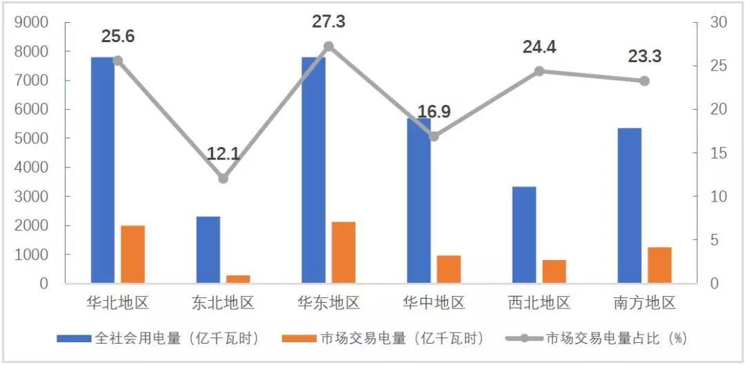 分區(qū)域市場來看,華東、華北、南方區(qū)域市場交易電量規(guī)模分別為2124億千瓦時、1996億千瓦時、1246億千瓦時,占全國市場交易電量的比重分別為28.2%、26.5%、16.6%,合計占全國市場交易電量比重的70%以上,對全國電力市場建設具有引領作用。