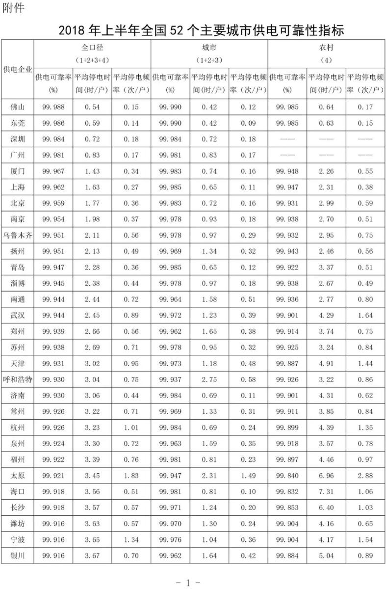 日前,國(guó)家能源局發(fā)布了2018年上半年全國(guó)主要城市用戶供電可靠性指標(biāo),用戶平均停電時(shí)間最短的三個(gè)城市分別為佛山(0.54小時(shí)/戶)、東莞(0.59小時(shí)/戶)、深圳(0.72小時(shí)/戶)。供電可靠性排名前十的城市分別為佛山、東莞、深圳、廣州、廈門、上海、北京、南京、烏魯木齊、揚(yáng)州。南網(wǎng)占據(jù)前四。詳情如下: