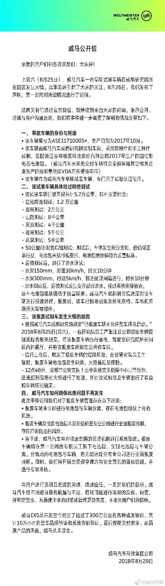 針對“意外”,威馬汽車內(nèi)部立即進(jìn)行了調(diào)查。隔天,調(diào)查結(jié)果就在微博進(jìn)行了公示,并且將原因進(jìn)行了澄清。