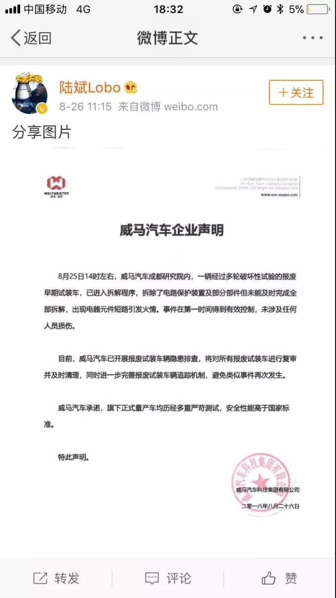 這一點從其聯(lián)合創(chuàng)始人陸斌個人微博“公示”發(fā)布的時間點可以看出,從事發(fā)時間(前一天的下午14點)到公示時間(第二天早晨11點),僅在24小時內(nèi)。這期間,威馬還要報警、處理現(xiàn)場以及對原因進(jìn)行調(diào)查。很明顯,調(diào)查結(jié)果一出,威馬就立即對公眾進(jìn)行了說明和交代。