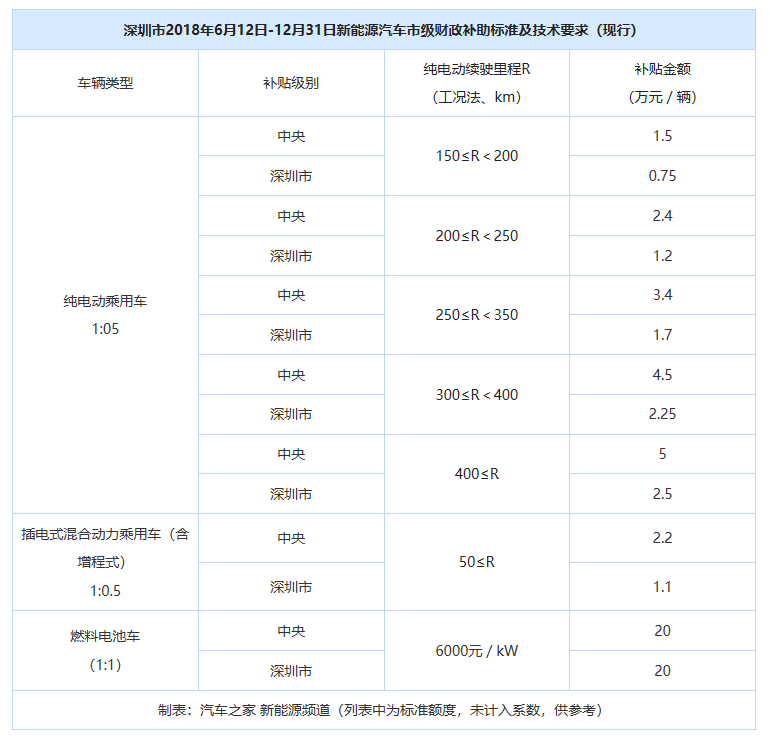 2、2018年2月12日至2018年6月11日上牌的新能源乘用車、純電動客車,按照深圳市2017年補(bǔ)貼標(biāo)準(zhǔn)的0.7倍補(bǔ)貼,純電動貨車和專用車按對應(yīng)標(biāo)準(zhǔn)的0.4倍補(bǔ)貼,燃料電池汽車補(bǔ)貼標(biāo)準(zhǔn)不變。