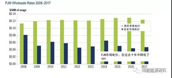 通過整合更有效的資源、從更廣闊的電力庫中調(diào)取從而減少對(duì)備用的需求,PJM市場(chǎng)幫助用戶每年至少節(jié)約230億美元。批發(fā)市場(chǎng)價(jià)格比以往任何時(shí)候都要低,在2016達(dá)到了歷史的低點(diǎn),在2017年稍有提升。從2008年到2017年,PJM的批發(fā)市場(chǎng)電價(jià)下跌了超過40%。在下面的圖表中,平均的PJM批發(fā)價(jià)格既包括發(fā)電價(jià)格也包括了輸電價(jià)格。居民用電價(jià)格是全PJM范圍的加權(quán)平均。批發(fā)市場(chǎng)價(jià)格使得用戶從降低的天然氣價(jià)格和發(fā)電機(jī)組的競(jìng)爭(zhēng)中收益。
