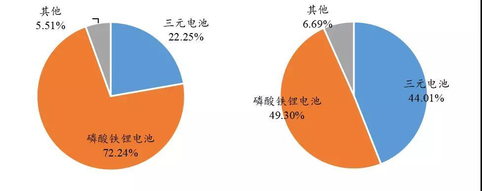 圖53 2016年(左)和2017年(右)中國(guó)不同材料動(dòng)力電池裝機(jī)量占比23