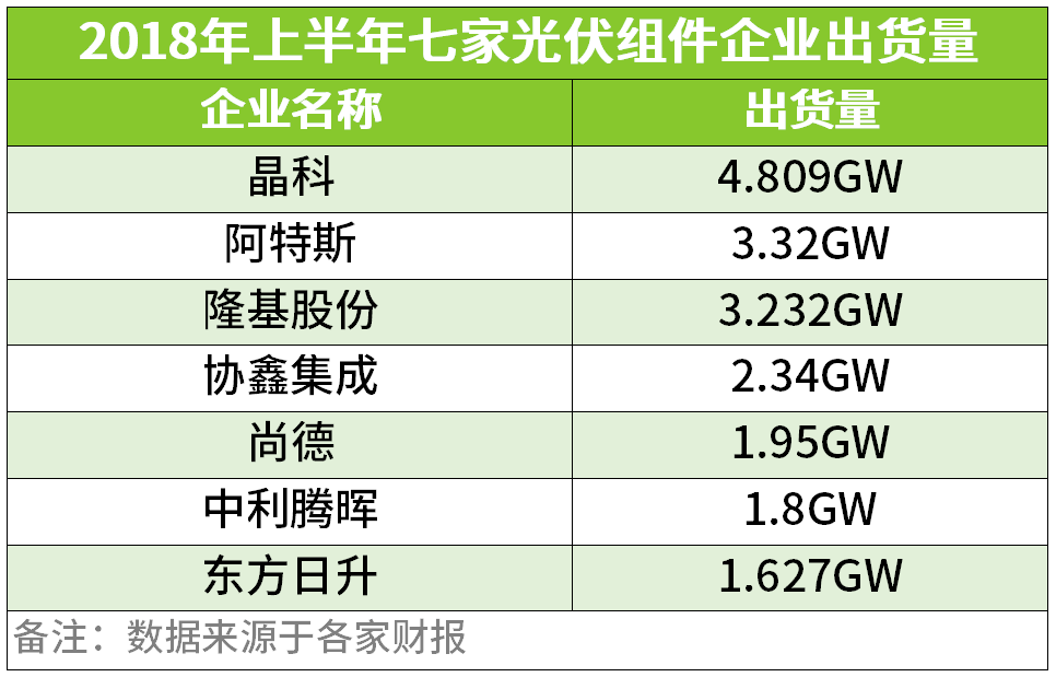 2018年上半年七家光伏組件企業(yè)出貨量統(tǒng)計: