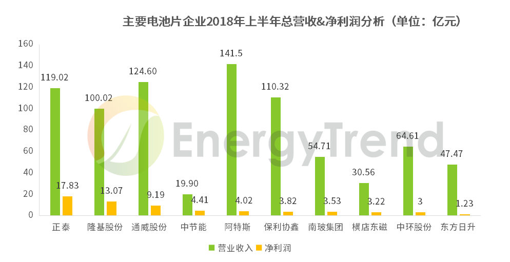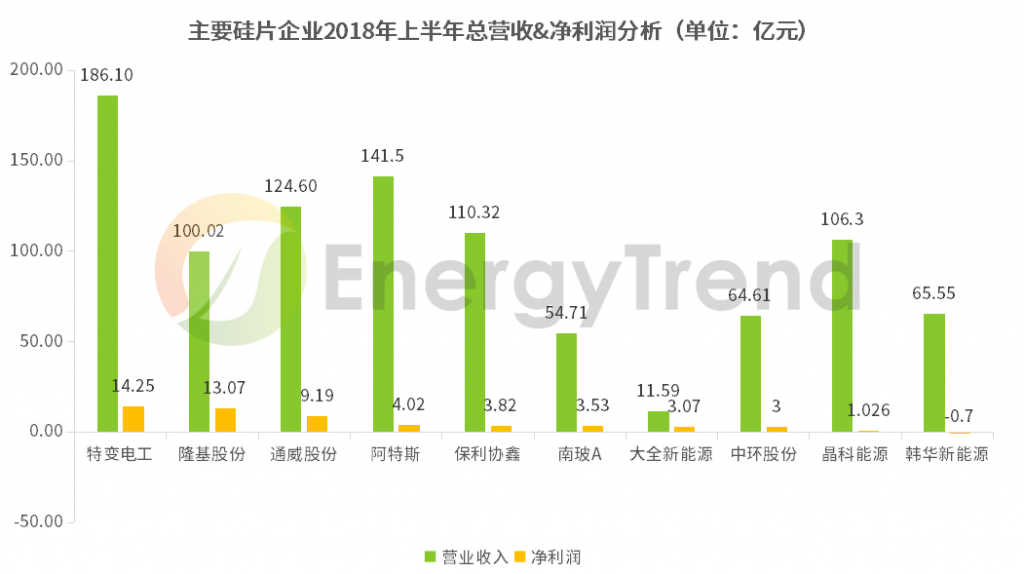 以下是EnergyTrend根據(jù)各企業(yè)的財報數(shù)據(jù)整理的硅片、電池片、組件三個環(huán)節(jié)主要企業(yè)的營收及凈利潤數(shù)據(jù):