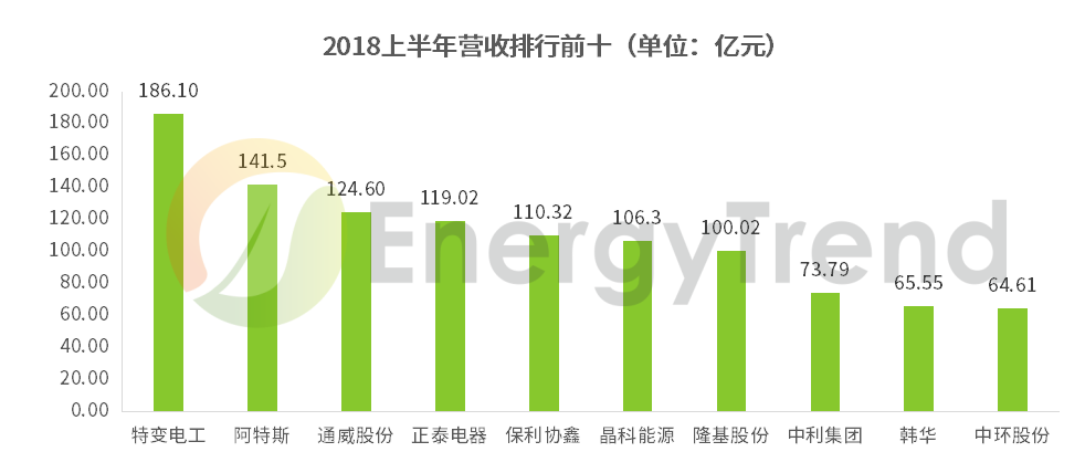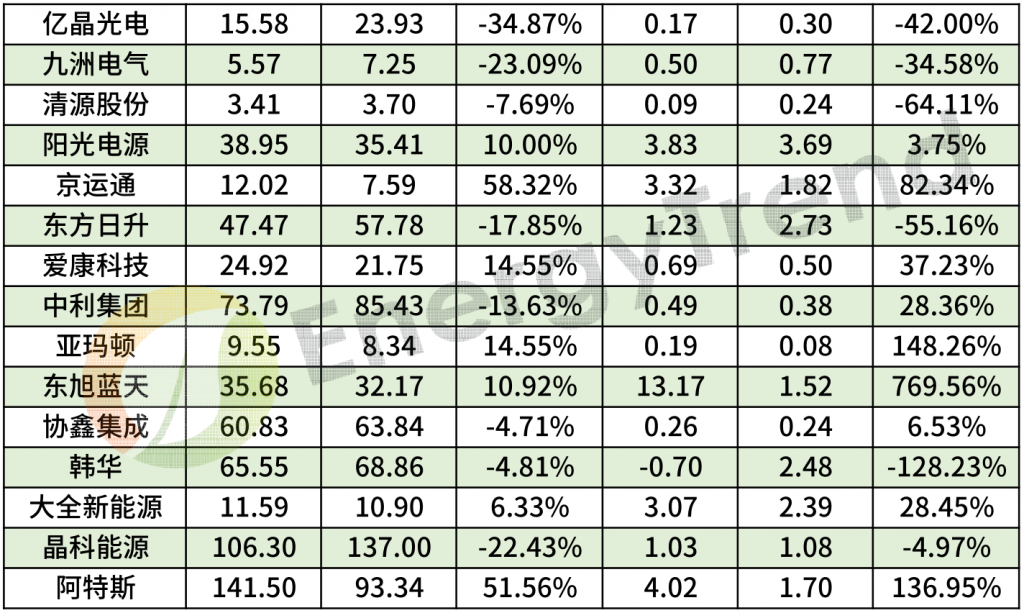 總體來看,有將近七成的企業(yè)營業(yè)額實現(xiàn)增長,特變電工、阿特斯、通威、正泰、保利協(xié)鑫、晶科、隆基營收均破百億,分別達到186.1億元、141.5億元、124.6億元、119.02億元、110.32、106.3億元、100.02億元。除此之外,中環(huán)、隆基、阿特斯等企業(yè)營收增幅超50%。