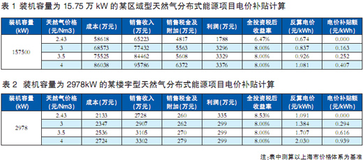 北京恩耐特分布能源技術(shù)有限公司總經(jīng)理馮江華以上海的價格體系為基準(zhǔn),對某四個天然氣分布式能源項(xiàng)目做了測算。得出的結(jié)論是,為保證項(xiàng)目8%的基本投資,當(dāng)氣價為3元/方時,反算出裝機(jī)容量為22萬kW、15.75萬kW的區(qū)域型項(xiàng)目電價應(yīng)分別為0.823元/kWh、0.837元/kWh;裝機(jī)容量為6082、2978kW的樓宇型項(xiàng)目電價則分別為1.183元/kWh、1.384元/kWh。當(dāng)氣價上升到3.5元/方時,上述四個項(xiàng)目的電價需分別調(diào)至0.95元/kWh、0.926元/kWh、1.352元/kWh、1.707元/kWh。(其中兩個項(xiàng)目的詳細(xì)測算見表1、表2)