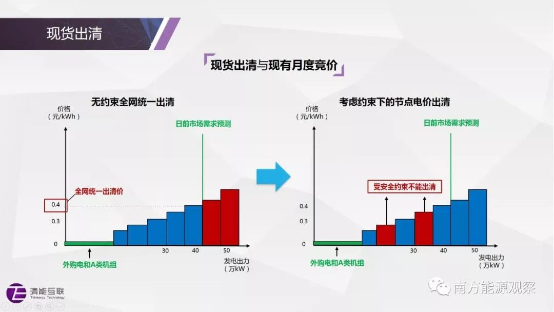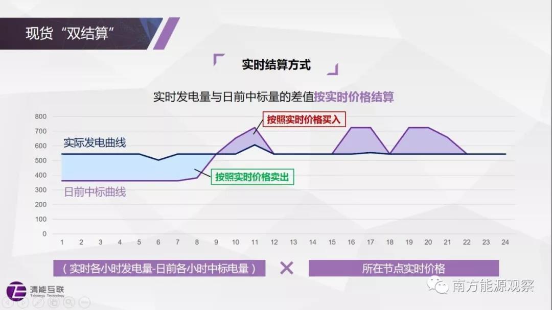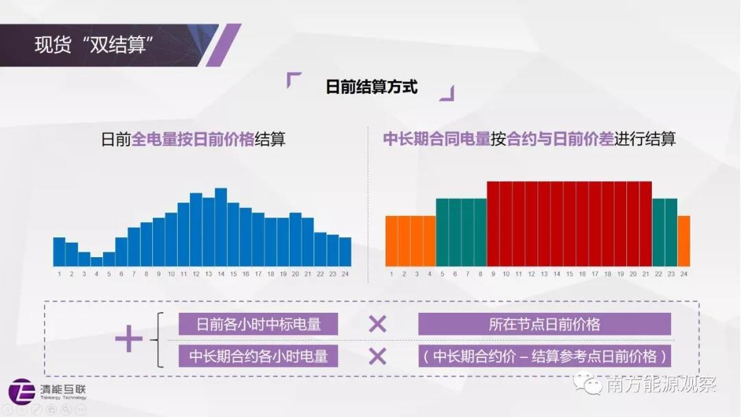 南方(以廣東起步)現(xiàn)貨市場采用雙結(jié)算:日前市場中標(biāo)量按日前現(xiàn)貨價格結(jié)算;實時市場中,與日前市場中標(biāo)量相比,實際多發(fā)(少用)的電量將以實時市場價格賣出,少發(fā)(多用)的電量將以實時市場價格買入,不再進(jìn)行額外的懲罰;中長期合約和基數(shù)電量根據(jù)日前市場價格進(jìn)行差價結(jié)算,起到鎖定交易電量價格的作用。