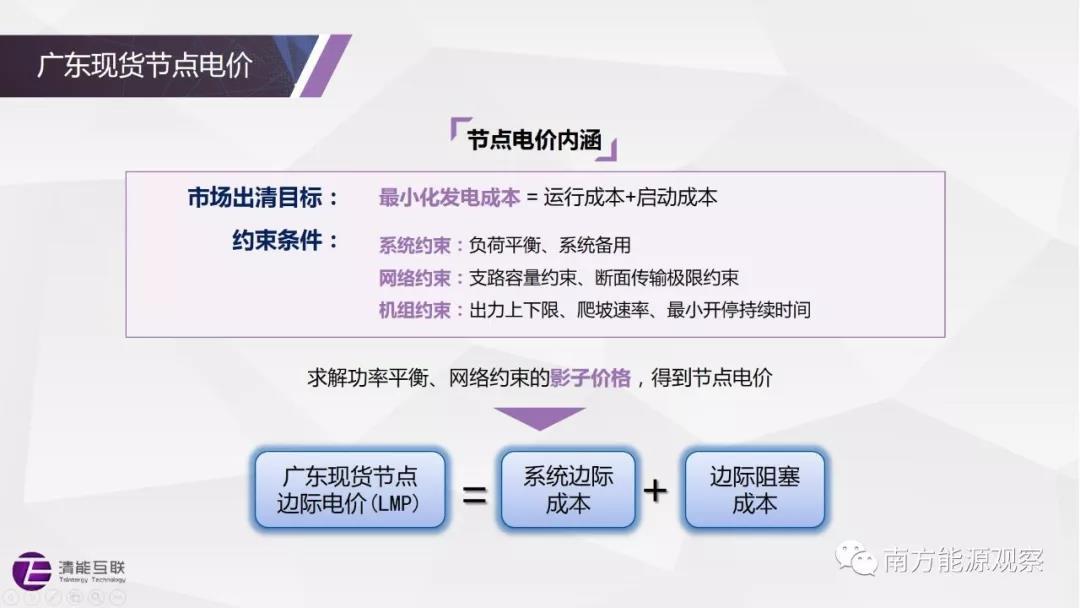 南方(以廣東起步)現(xiàn)貨市場的節(jié)點電價將由系統(tǒng)電能價格和阻塞價格構(gòu)成。系統(tǒng)電能價格反映全市場的電力供需情況,阻塞價格反映節(jié)點所在位置的電網(wǎng)阻塞情況。當(dāng)網(wǎng)絡(luò)傳輸出現(xiàn)阻塞時,市場將會“拆分”為多個分區(qū),使得不同地理位置的邊際價格產(chǎn)生差異,偏離“無網(wǎng)絡(luò)約束”狀態(tài)下的邊際機(jī)組申報價格。節(jié)點電價的內(nèi)在機(jī)理非常復(fù)雜,一般而言,負(fù)荷大小和分布、發(fā)電側(cè)報價、發(fā)電機(jī)組物理參數(shù)、網(wǎng)絡(luò)傳輸能力是影響節(jié)點電價的主要因素。因此,市場主體在參與現(xiàn)貨市場申報時,需要結(jié)合市場運(yùn)營機(jī)構(gòu)公布的運(yùn)行信息進(jìn)行分析決策。