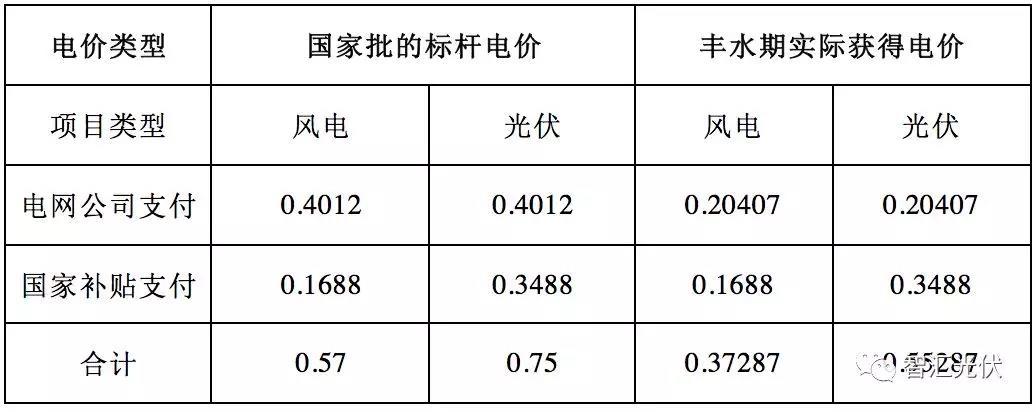根據(jù)上表,在豐水期(6~10月),風(fēng)電、光伏項目的上網(wǎng)電價相對于國家批復(fù)的標(biāo)桿電價降低了0.19713元/kWh,將帶來項目收益的大幅降低。