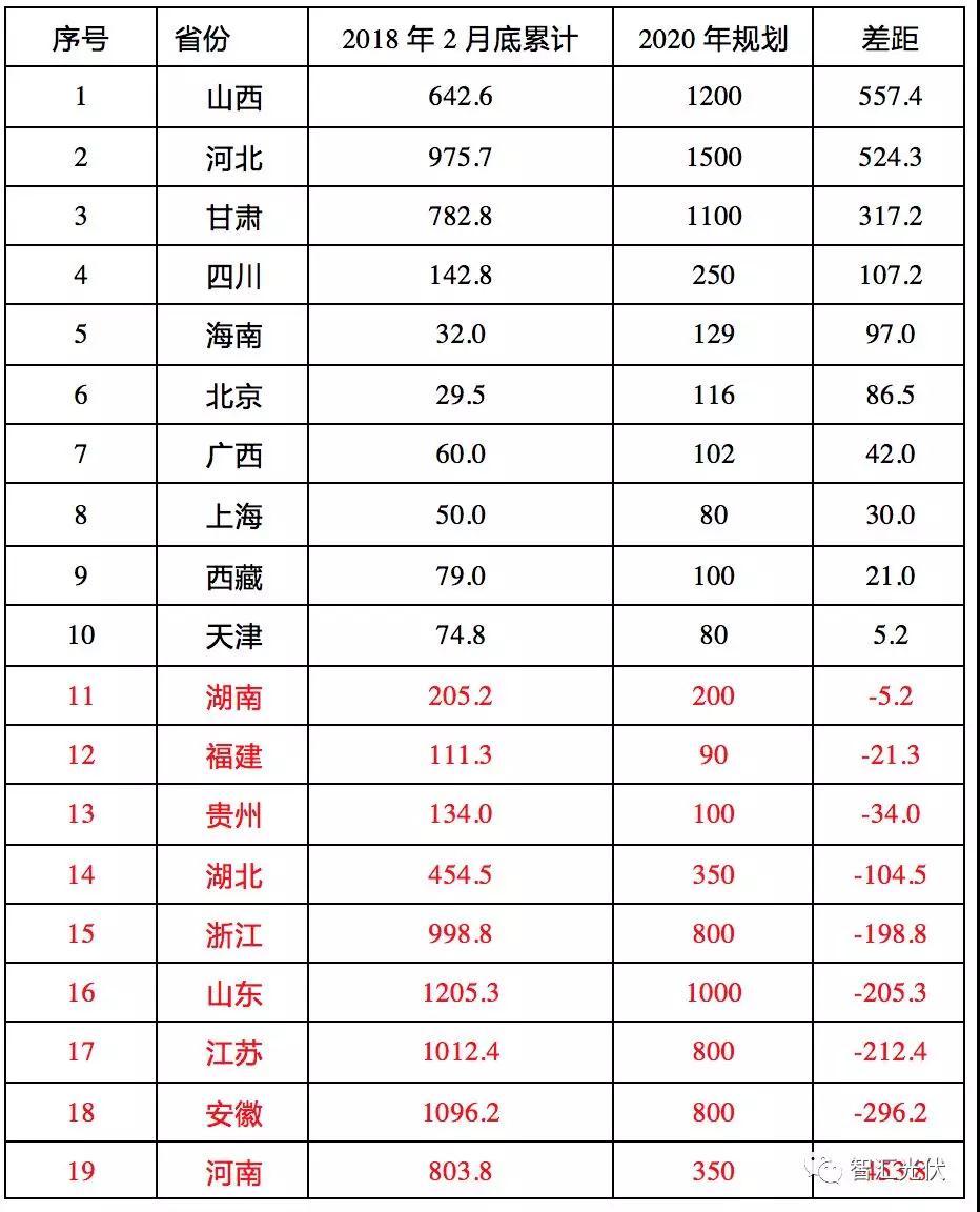 表:全國(guó)各省“十三五”光伏規(guī)劃與實(shí)際裝機(jī)容量(2018.2)統(tǒng)計(jì)(單位:萬(wàn)kW)
