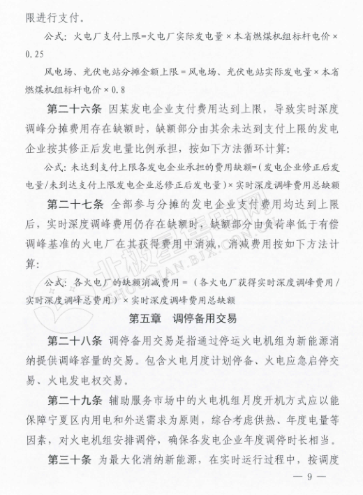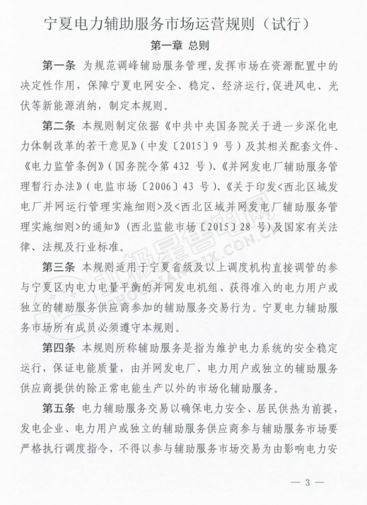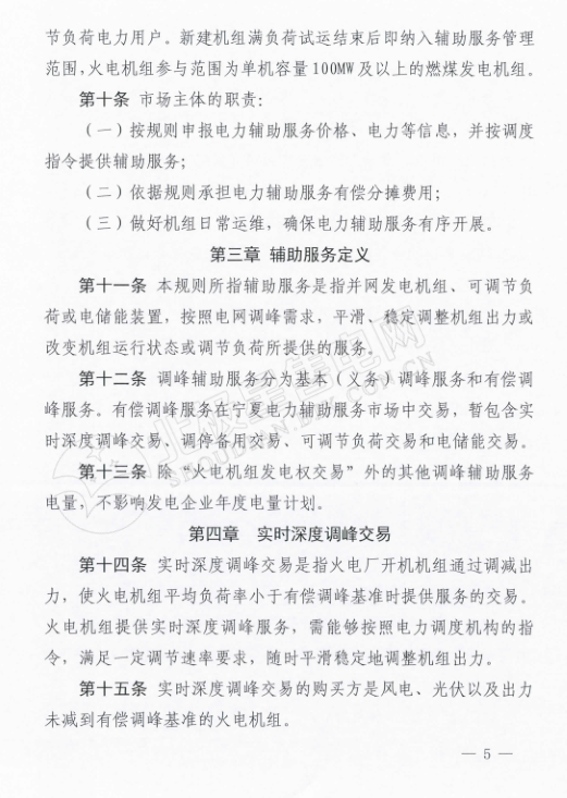 在《寧夏電力輔助服務(wù)市場(chǎng)運(yùn)營規(guī)則》中,規(guī)定電力輔助服務(wù)市場(chǎng)的市場(chǎng)主體為寧夏電網(wǎng)統(tǒng)調(diào)并網(wǎng)發(fā)電廠(火電、風(fēng)電、光伏),以及經(jīng)市場(chǎng)準(zhǔn)入的電儲(chǔ)能和可調(diào)節(jié)負(fù)荷電力用戶。新建機(jī)級(jí)組滿負(fù)荷試運(yùn)結(jié)束后即納入輔助服務(wù)管理范圍,火電機(jī)組參與范圍為單機(jī)容量100MW及以上的燃煤發(fā)電機(jī)組。與前不久剛剛發(fā)布的甘肅的電力輔助服務(wù)運(yùn)營規(guī)則中規(guī)定的市場(chǎng)主體相比較,缺少了水電企業(yè)的身影。