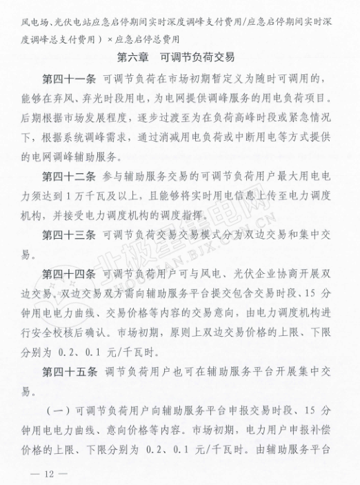 可調(diào)節(jié)負(fù)荷交易模式分為雙邊交易和集中交易兩種。參與輔助服務(wù)交易的可調(diào)節(jié)負(fù)荷用戶最大用戶電力須達(dá)到1萬千瓦及以上??烧{(diào)節(jié)負(fù)荷用戶可與風(fēng)電、光伏企業(yè)協(xié)商開展雙邊交易,并規(guī)定了雙邊交易價(jià)格的上限為0.2元/千瓦時(shí),下限0.1元/千瓦時(shí)。