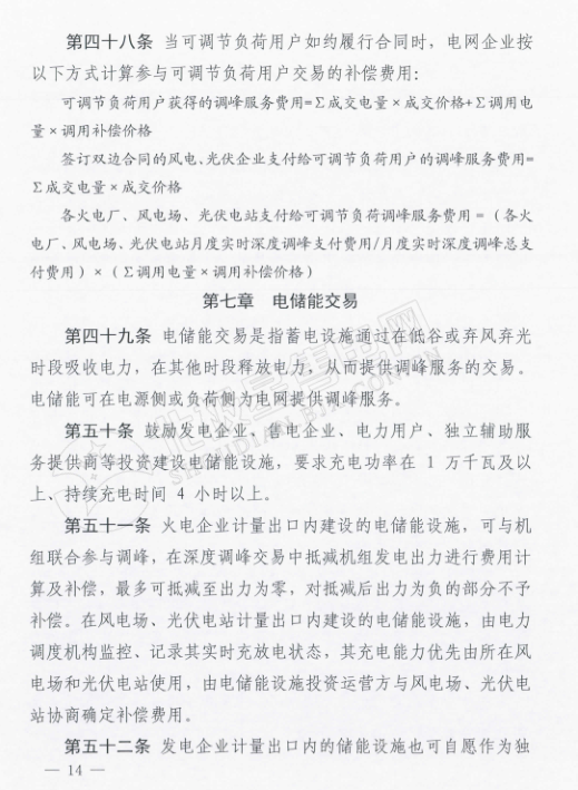 鼓勵(lì)發(fā)電企業(yè)、售電企業(yè)、電力用戶、獨(dú)立輔助服務(wù)提供商等投資建設(shè)電儲(chǔ)能設(shè)備,要求充電功率在1萬千瓦及以上、持續(xù)充電時(shí)間4小時(shí)以上。同樣,電儲(chǔ)能設(shè)施也可與風(fēng)電、光伏企業(yè)協(xié)商開展雙邊交易。交易價(jià)格的上限為0.2元/千瓦時(shí),下限0.1元/千瓦時(shí)。