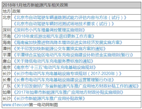 中國儲能網(wǎng)訊:2018年1月,國務(wù)院、科技部、發(fā)改委等部門出臺了新能源汽車相關(guān)政策。北京、深圳、濟南、海南、漳州、平潭、唐山、南京、長沙、廣東、如皋、長春等12省市出臺新能源汽車相關(guān)政策。其中北京出臺了國內(nèi)首個自動駕駛車輛封閉測試場地技術(shù)要求和車輛測試能力評估內(nèi)容與方法。廣東和長沙出臺了2018年新能源汽車補貼政策。平潭、長沙、唐山、南京和長春出臺了充電基礎(chǔ)設(shè)施政策。