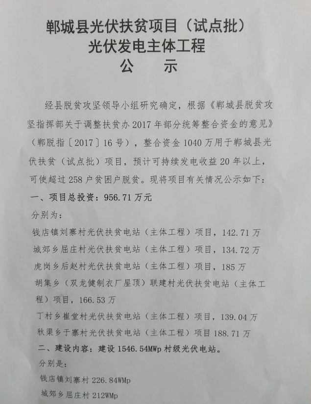 河南鄲城縣公示光伏扶貧項目光伏發(fā)電主體工程