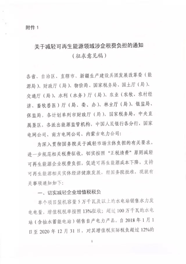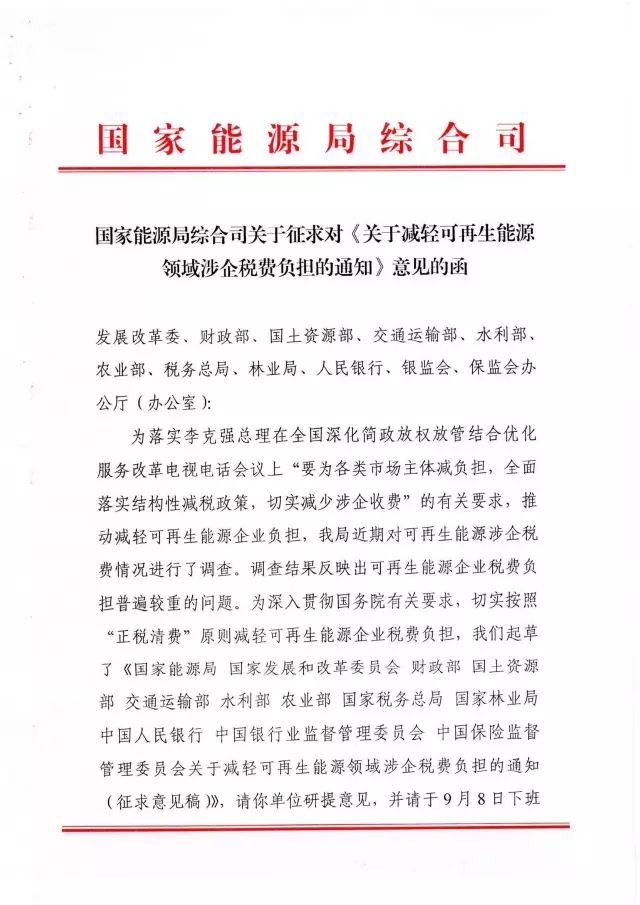 中國儲能網(wǎng)訊:近日,國家能源局綜合司下發(fā)了關(guān)于征求對《關(guān)于減輕可再生能源領(lǐng)域涉企稅費負擔(dān)的通知》(以下簡稱《通知》)意見的函?!锻ㄖ犯鶕?jù)可再生能源企業(yè)稅費負擔(dān)普遍較重的實際情況,明確了可再生能源企業(yè)的稅費減免政策。