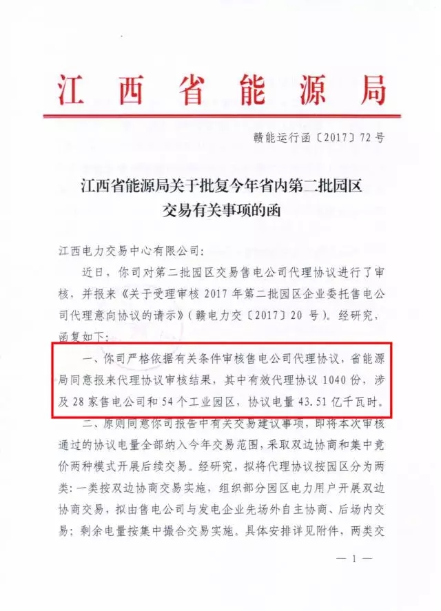 中國(guó)儲(chǔ)能網(wǎng)訊:9月5日,江西省能源局發(fā)布了《關(guān)于批復(fù)今年省內(nèi)第二批園區(qū)交易有關(guān)事項(xiàng)的函》。其中涉及到的有效代理協(xié)議1040份,28家售電公司和54個(gè)工業(yè)園區(qū),協(xié)議電量共43.51億千瓦時(shí)。