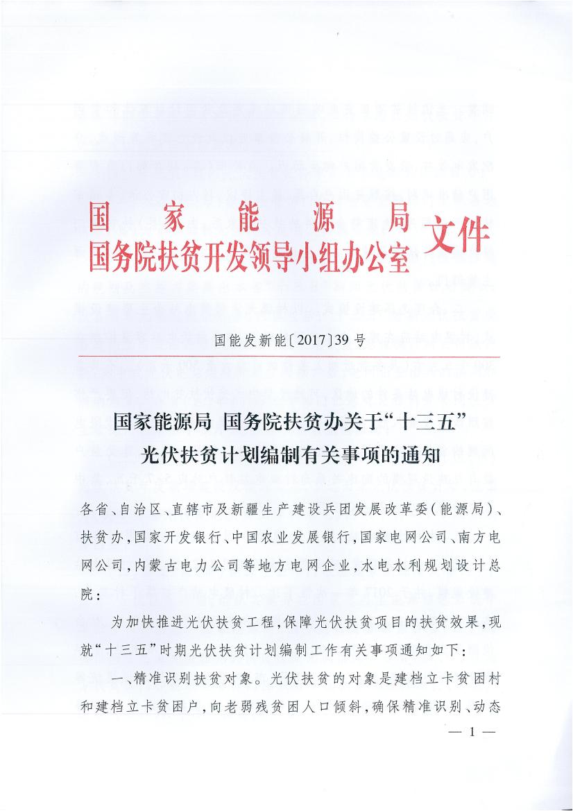 國家能源局 國務(wù)院扶貧辦關(guān)于“十三五”光伏扶貧計劃編制有關(guān)事項的通知