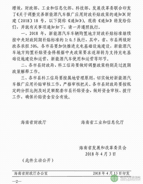 中國儲能網(wǎng)訊:海南省轉(zhuǎn)發(fā)四部委發(fā)布的《關(guān)于調(diào)整完善新能源汽車推廣應(yīng)用財政補貼政策的通知》,對海南省新能源汽車地補做出規(guī)定和解釋。2018年,新能源汽車車輛購置地方財政補貼標(biāo)準(zhǔn)繼續(xù)按中央財政同期補貼標(biāo)準(zhǔn)的1:0.5執(zhí)行,其中,省、市縣兩級財政各承擔(dān)50%。各市縣要加快推進(jìn)充電基礎(chǔ)設(shè)施建設(shè),新能源汽車地方購置補貼資金將根據(jù)中央政策要求逐漸轉(zhuǎn)為支持充電基礎(chǔ)設(shè)施建設(shè)和運營、新能源汽車使用和運營等環(huán)節(jié)。